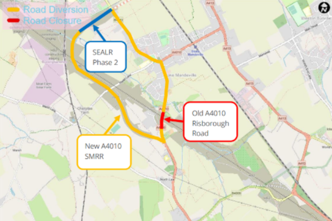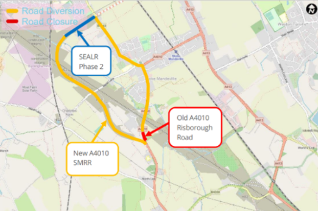From 5 November, road users will be able to travel on the new stretch of A4010 (the combined SEALR Phase 2 dual carriageway and roundabouts with HS2 Ltd’s Stoke Mandeville Relief Road) which connects Risborough Road (A4010) to Lower Road (B4443) north of Stoke Mandeville.