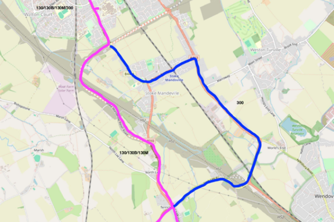 From November, Redline will divert service 130 via the new A4010 which will then go directly to Terrick (the pink route in the image below).